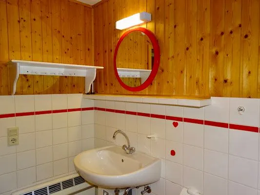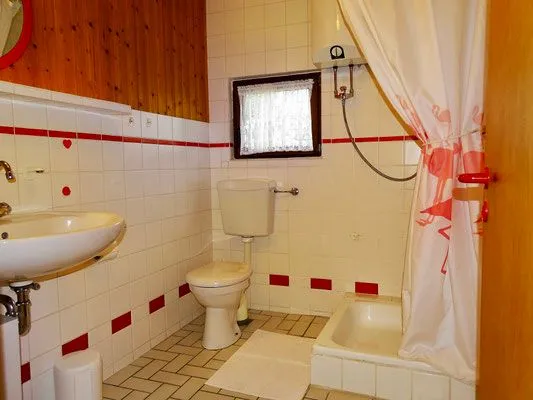 Das Badezimmer ist mit Dusche, WC und Waschbecken ausgestattet.