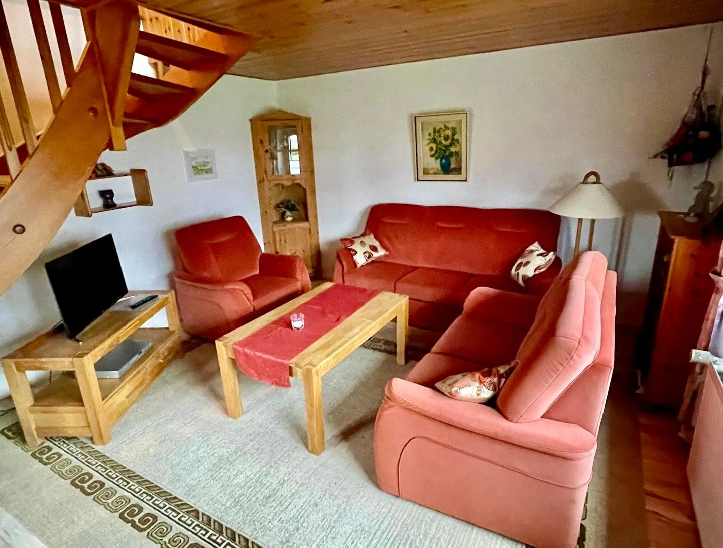 Im gemütlichen Wohnzimmer erwarten Sie eine bequeme Couch, Sessel, Couchtisch sowie ein Fernseher (SAT) und ein Essbereich für gesellige Stunden.