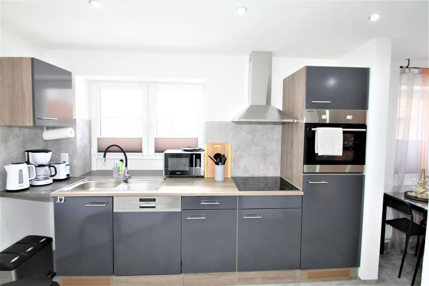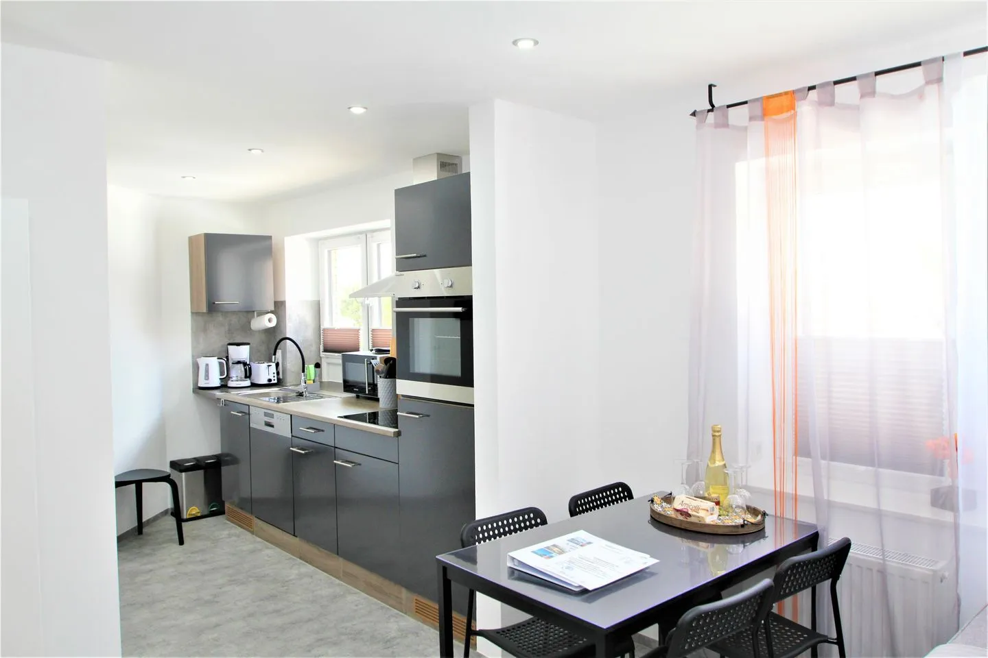 Das stilvolle Badezimmer ist mit einer modernen Dusche, einem Waschbecken und einem Haartrockner ausgestattet. Frische Bettwäsche und Handtücher können auf Wunsch gegen eine geringe Gebühr zur Verfügung gestellt werden, sodass Sie sich um nichts kümmern müssen. In der voll ausgestatteten Küche mit gemütlichem Essbereich finden Sie alles, was das Herz begehrt: einen Geschirrspüler, eine Mikrowelle, einen Kühlschrank, einen Backofen, einen Wasserkocher, einen Eierkocher, einen Toaster sowie eine Kaffeemaschine. So können Sie morgens mit einer duftenden Tasse Kaffee in den Tag starten und sich nach einem erlebnisreichen Ausflug ein köstliches Abendessen zaubern. Damit auch die Kleinsten bestens versorgt sind, stehen auf Anfrage ein Reisebett sowie ein Hochstuhl für Kinder bis zwei Jahren bereit.